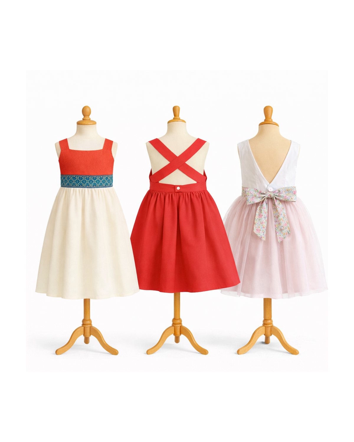 Complétez ces robes avec les options cols, manches et jupes de votre choix. Les cols et manches présentés ci-dessous sont compatibles avec ces 3 robes. Les jupes s'ajustent avec ces 3 robes et peuvent aussi se réaliser aussi comme des jupes indépendantes, montées sur ceintures.