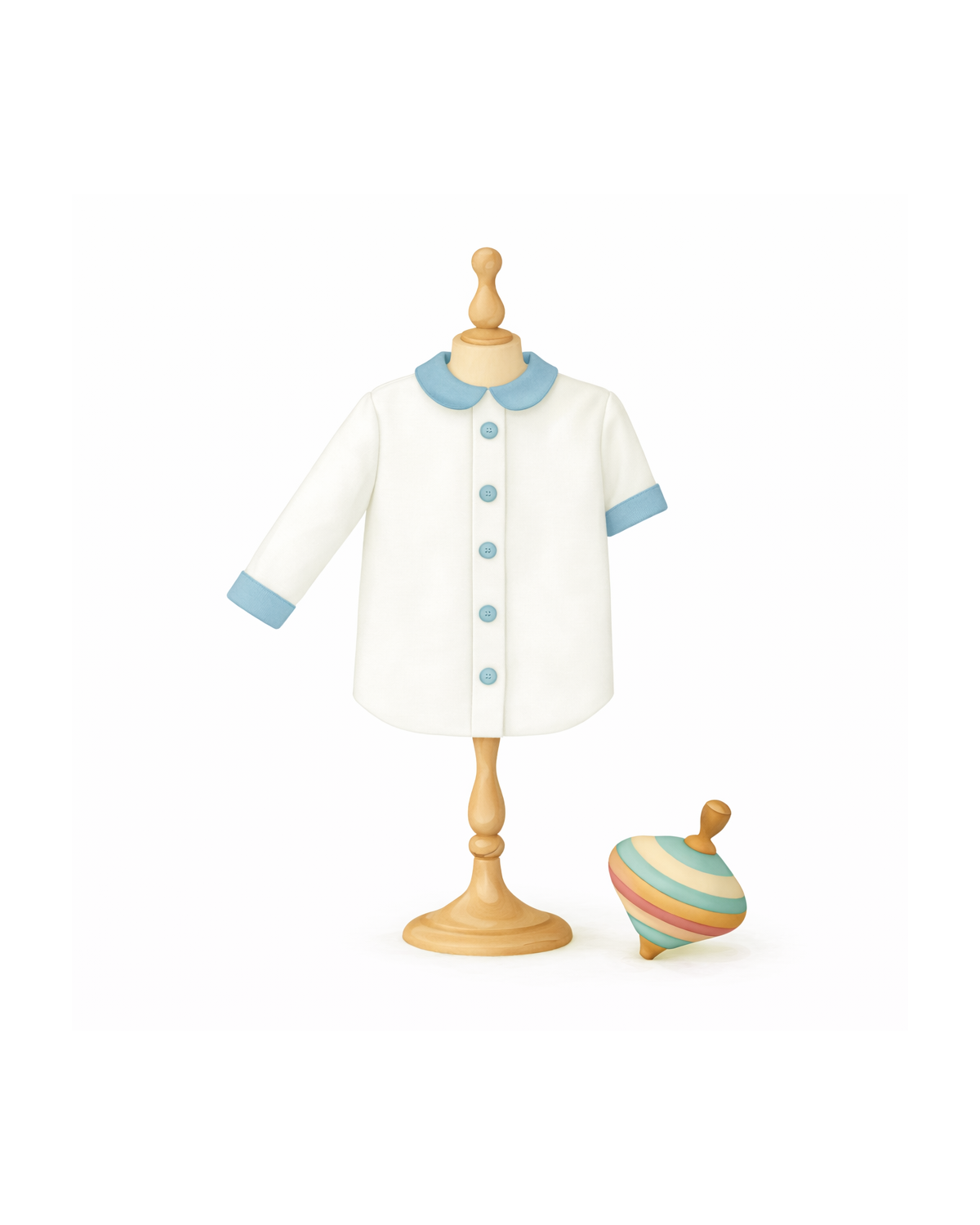 Patron de chemise boutonnée et col claudine, proposé avec des manches courtes à revers et des manches longues avec bracelets de poignets.