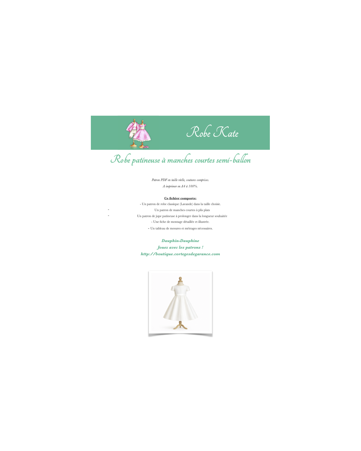 Si vous souhaitez varier le col, les manches ou la forme de la jupe, vous trouverez les pièces compatibles sous cette fiche produit.