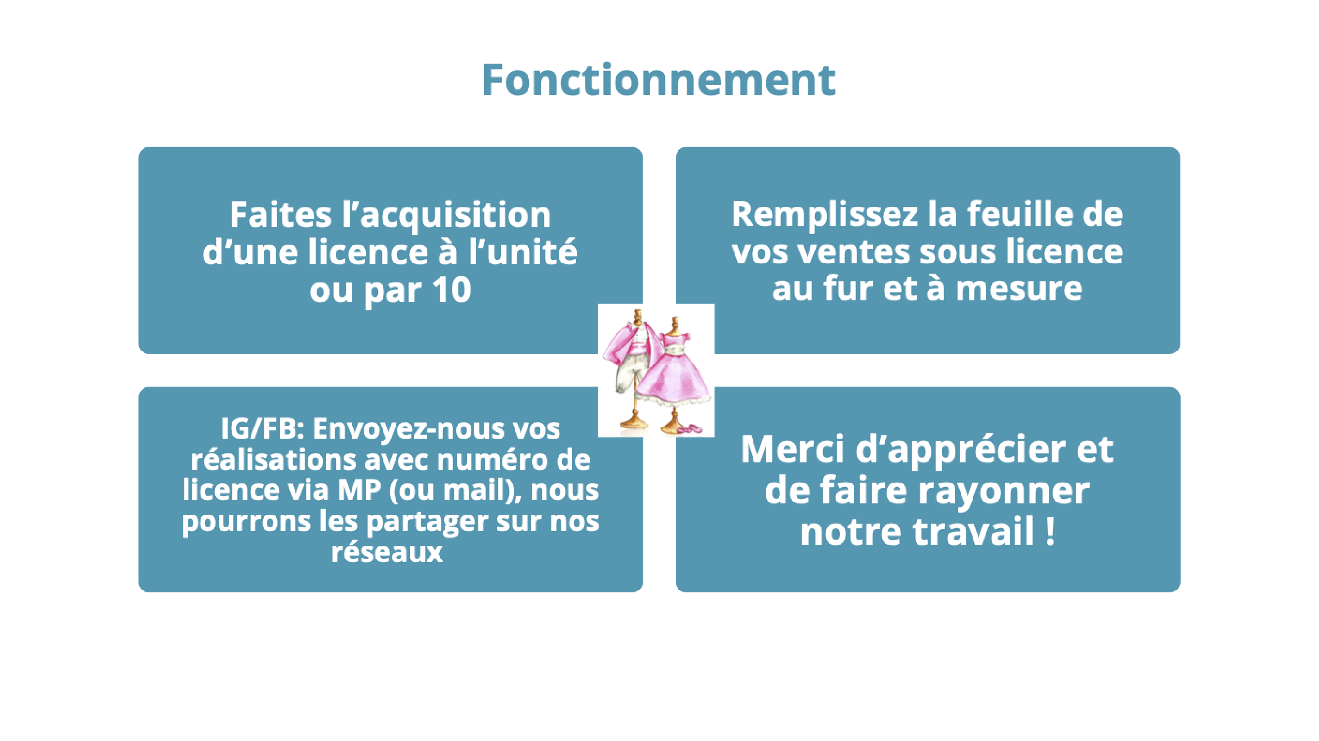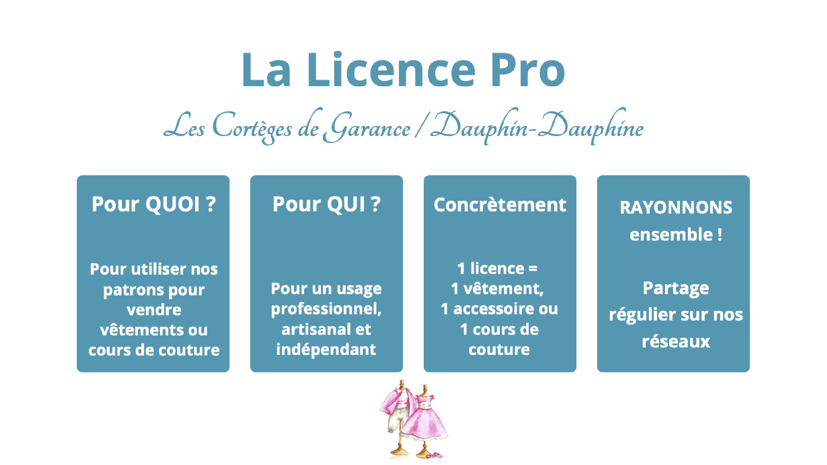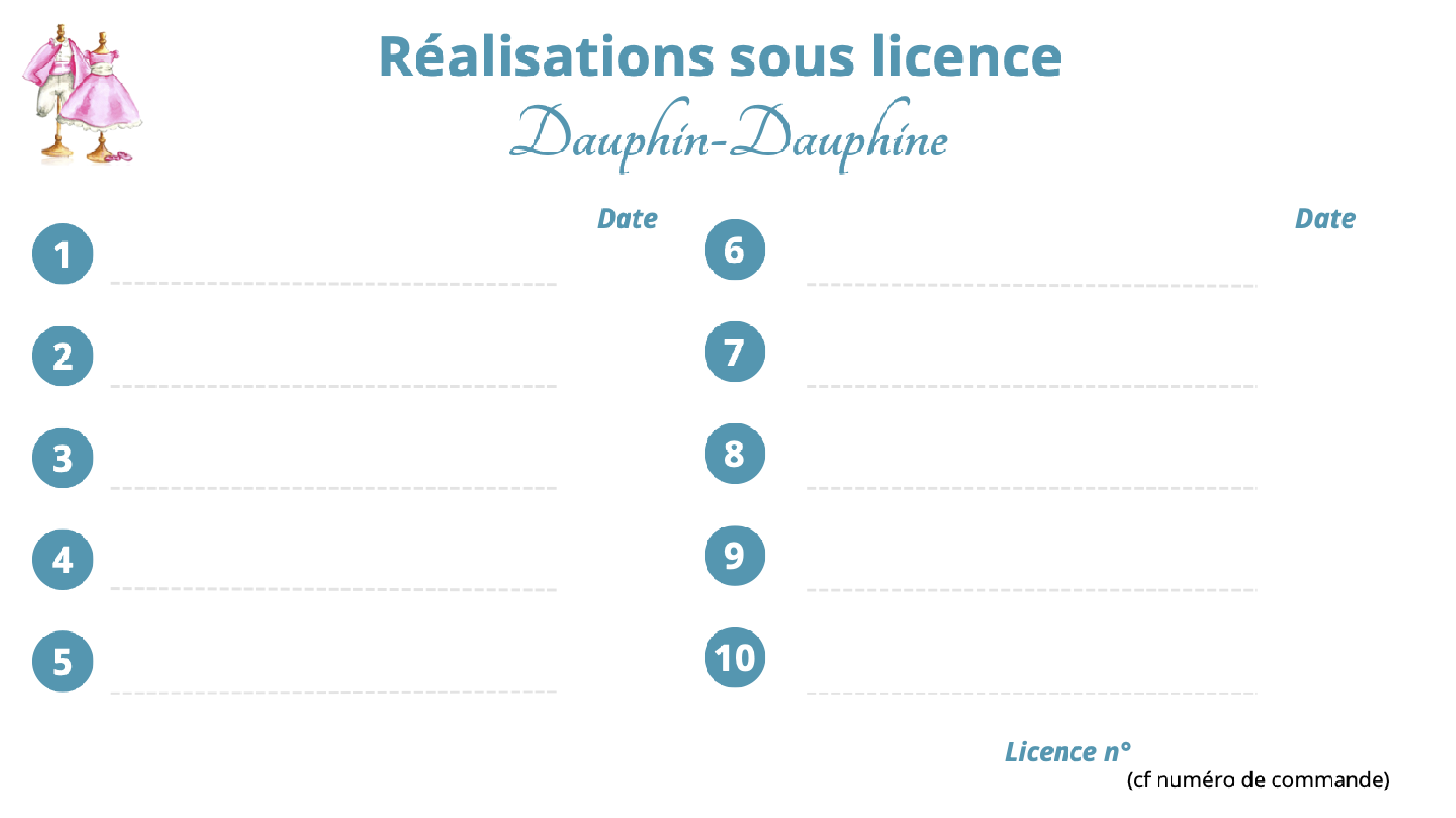 Proposée à l'unité, par 10 ou 50, la licence vous permet d'utiliser les patrons Dauphin-Dauphine© ou Les Cortèges de Garance© en toute légalité dans un cadre artisanal et commercial.