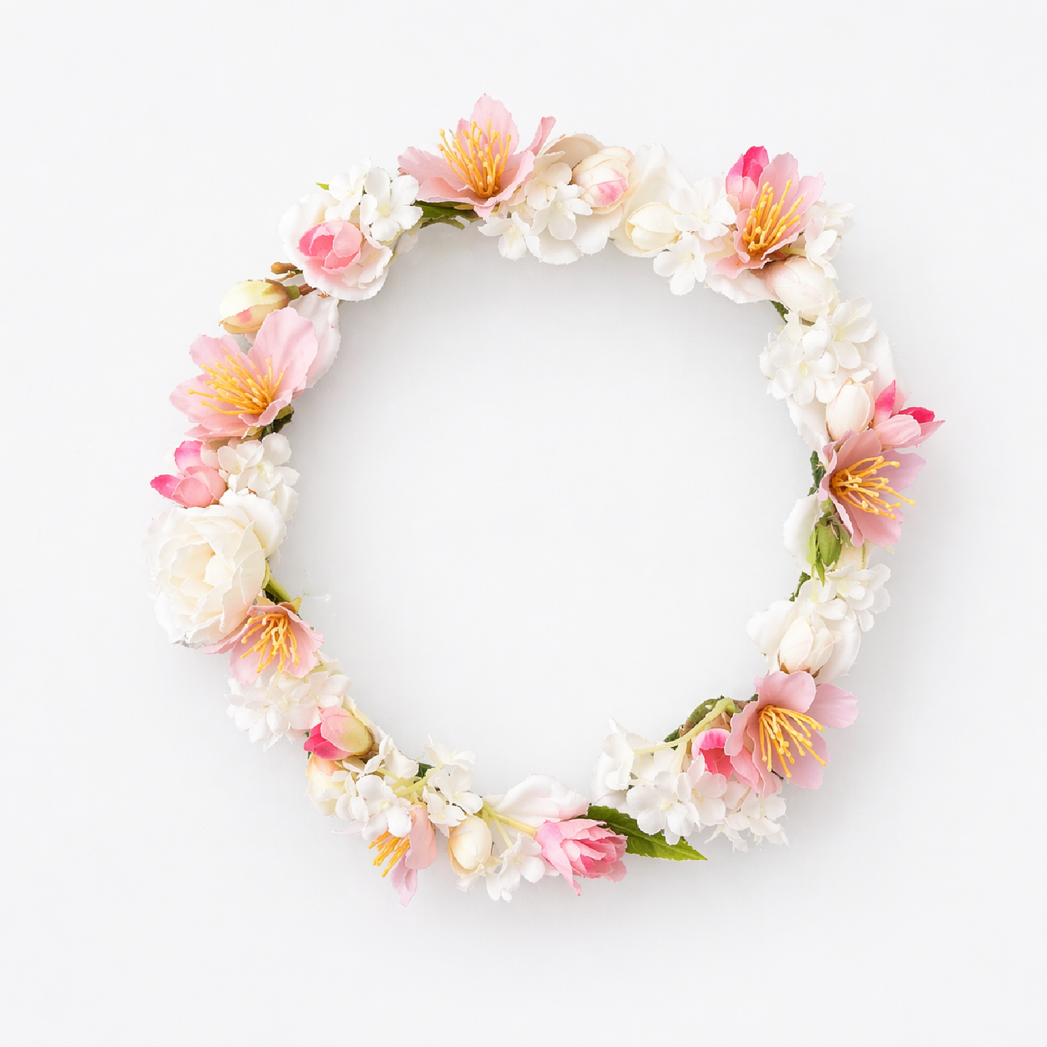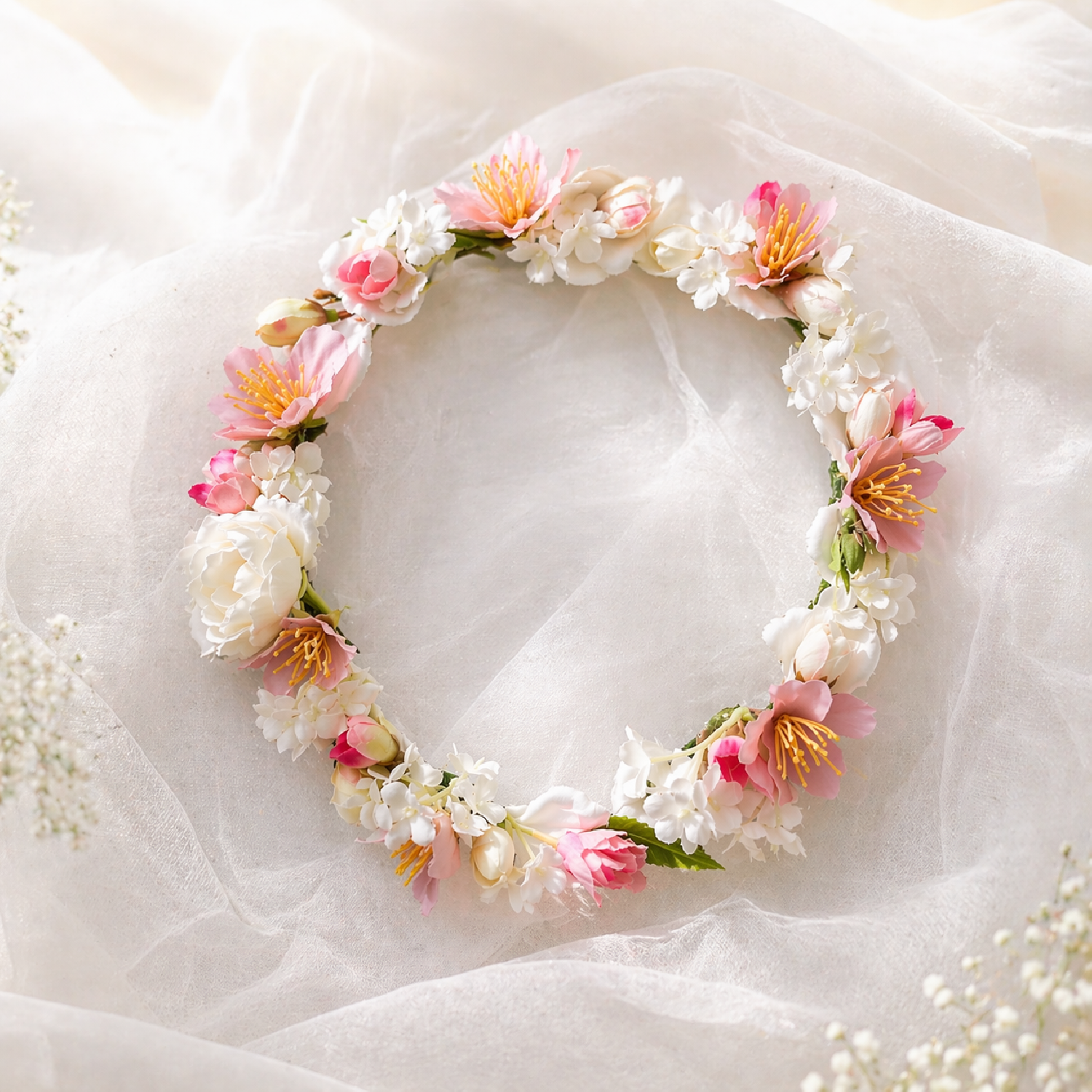 Délicate et poétique, cette couronne de fleurs évoque la douceur des premiers beaux jours. Ses nuances de rose cerisier, relevées de blanc poudré, apportent une touche tendre et raffinée aux tenues de cérémonie.