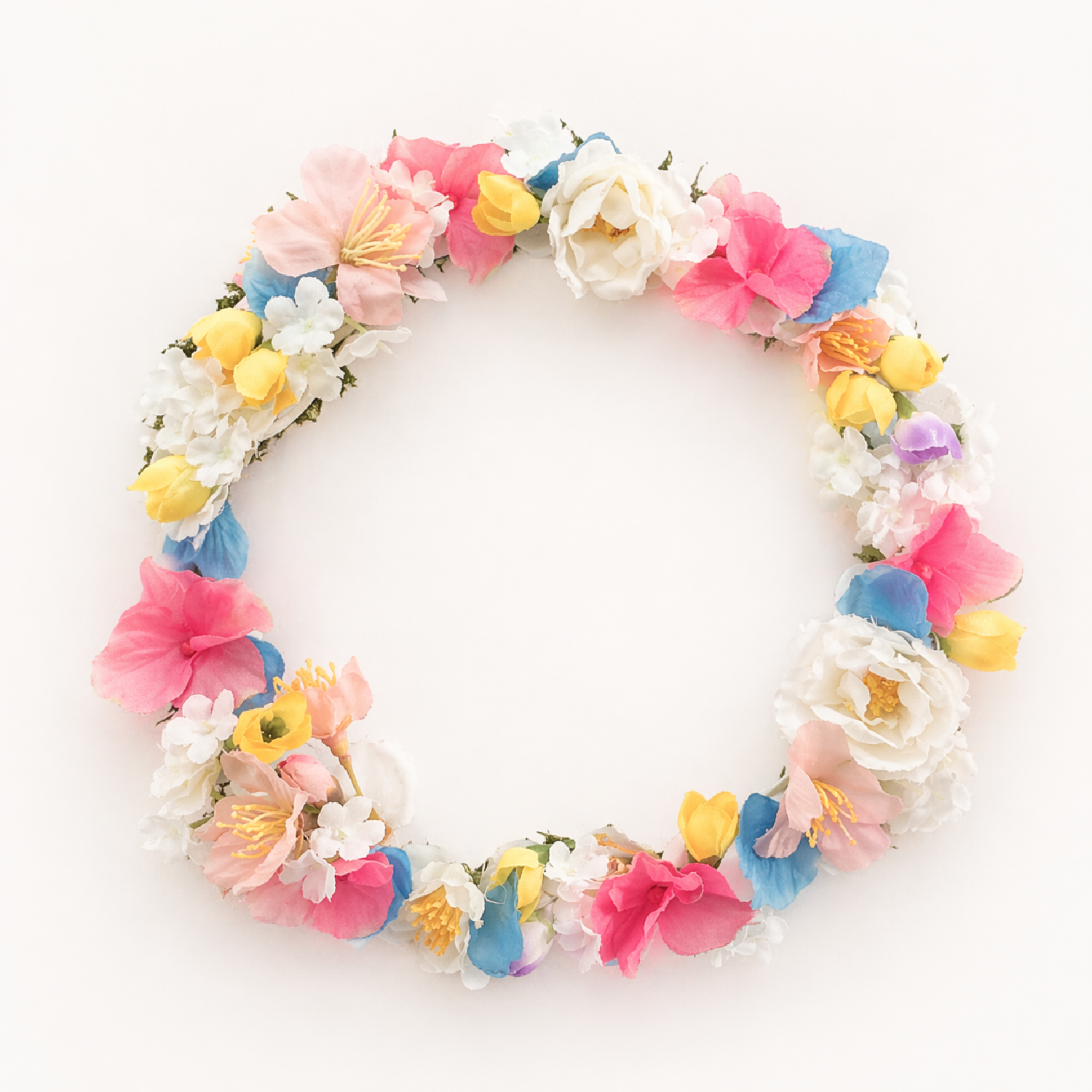 Joyeuse et pleine de vie, cette couronne mêle harmonieusement plusieurs teintes : rose clair et soutenu, jaune, bleu, parme et blanc. Elle illumine instantanément une tenue et apporte une note de gaieté élégante.
