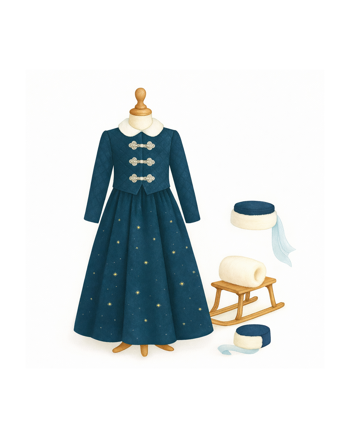 Glissant sur l'épaisse neige des steppes, la troïka file à vive allure vers St Pétersbourg, emmenant à son bord trois princesse russes auprès de la Tsarine. Vêtues de vestes colorées à col de fourrure blanche bien chaude, elles affrontent le froid vif, les mains protégées d'un indispensable manchon assorti.