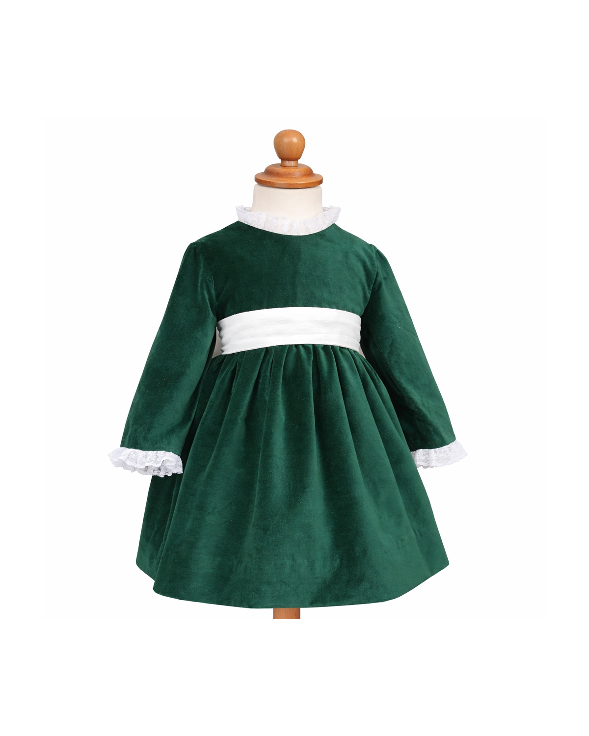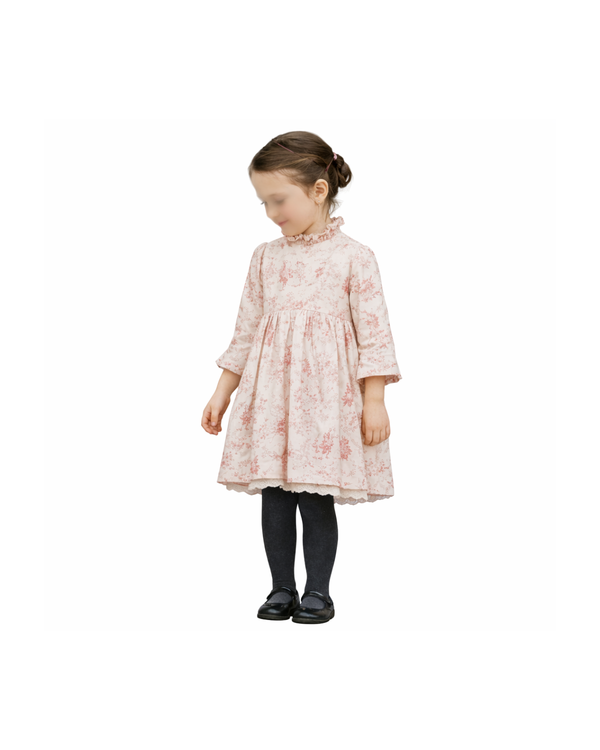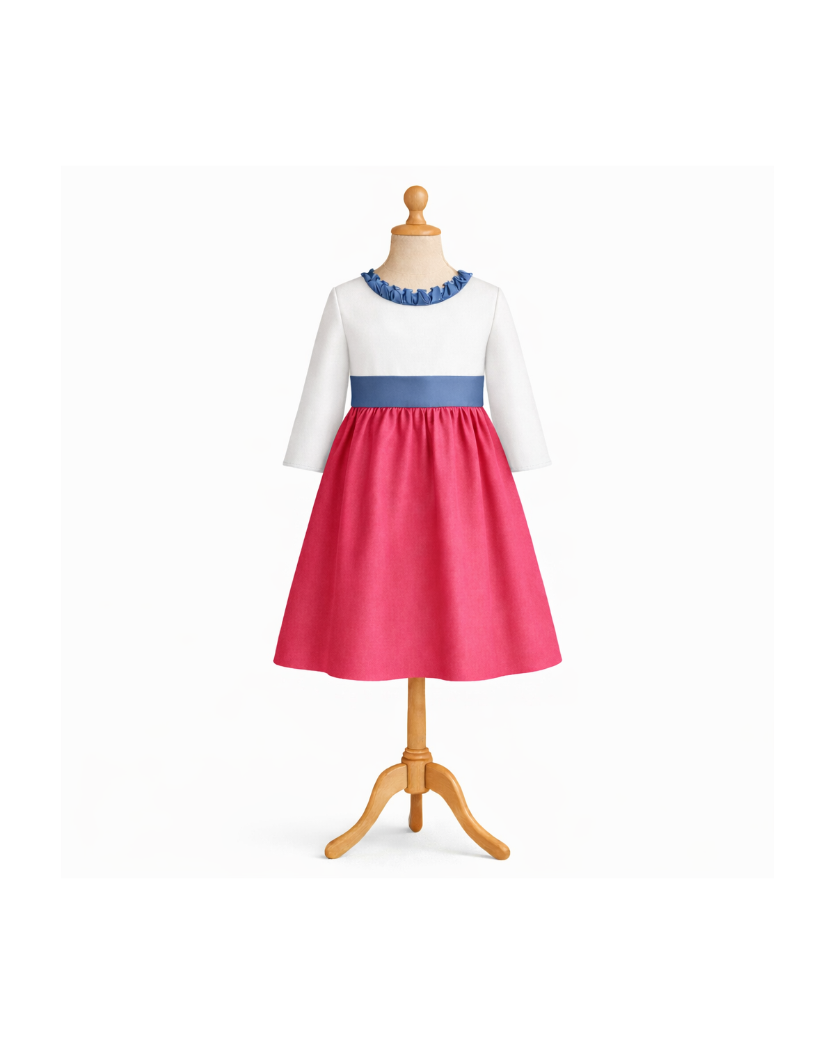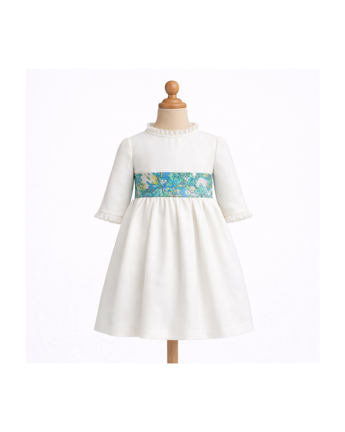 Son corsage épuré met en valeur une encolure haute délicatement soulignée d'un col victorien, tandis que les manches trois-quart, soulignées d'un galon froncé, apportent douceur et raffinement. La taille haute est valorisée par une large ceinture (non incluse), idéale pour accueillir un tissu contrastant ou un Liberty assorti au thème du cortège.