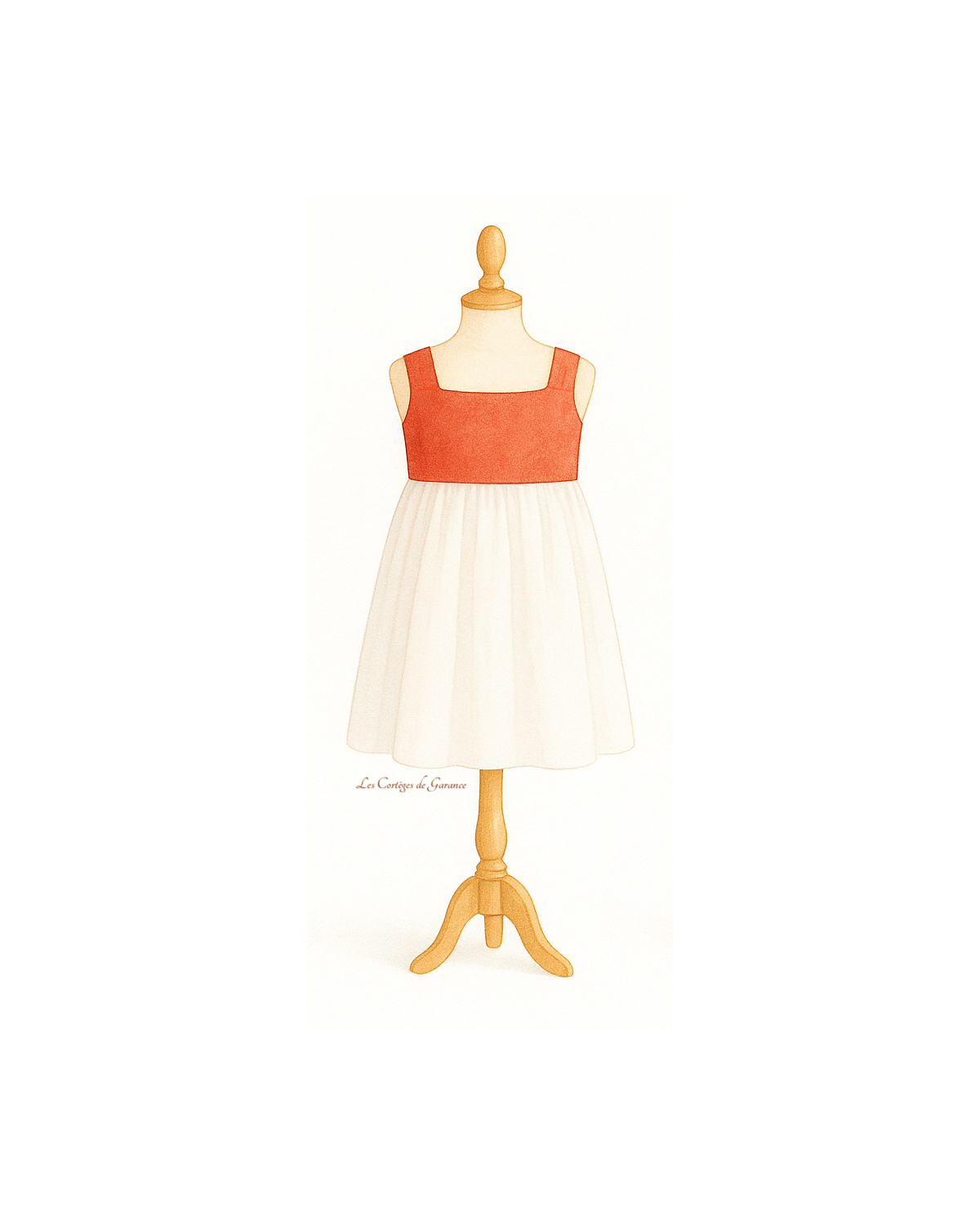 Le patron de robe Fleur de Garance allie une taille haute, de larges bretelles et un jupe à pli creux.