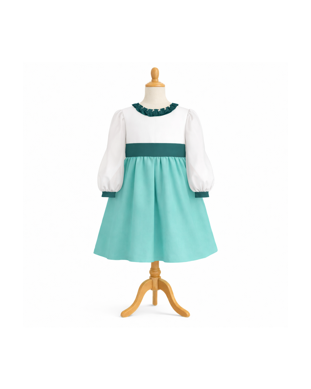 D'inspiration espagnole, cette robe s'orne d'une taille, d'un col frou-frou, et de manches longues bouffantes.