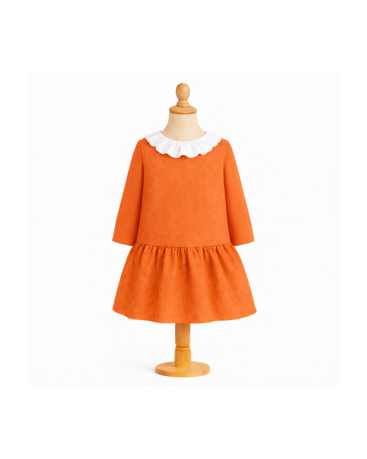 Patron de robe taille basse à manches trois-quart et col volanté: un modèle très élégant et en même temps facile à porter, même pour les demoiselles les plus âgées.